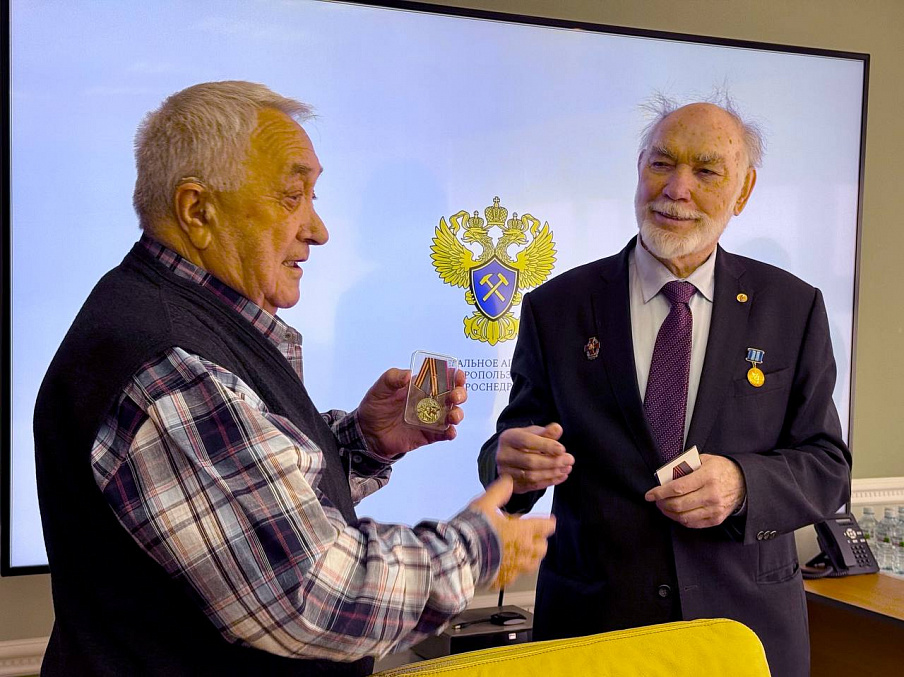 Перед началом обсуждения повестки дня состоялась церемония награждения — Евгений Фаррахов вручил члену Общественного совета Леониду Твердохлебову медаль имени А.Е.Ферсмана «За заслуги в геологии» и медаль «Дети войны».
